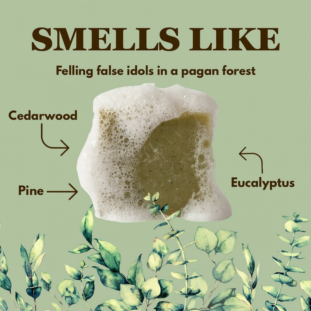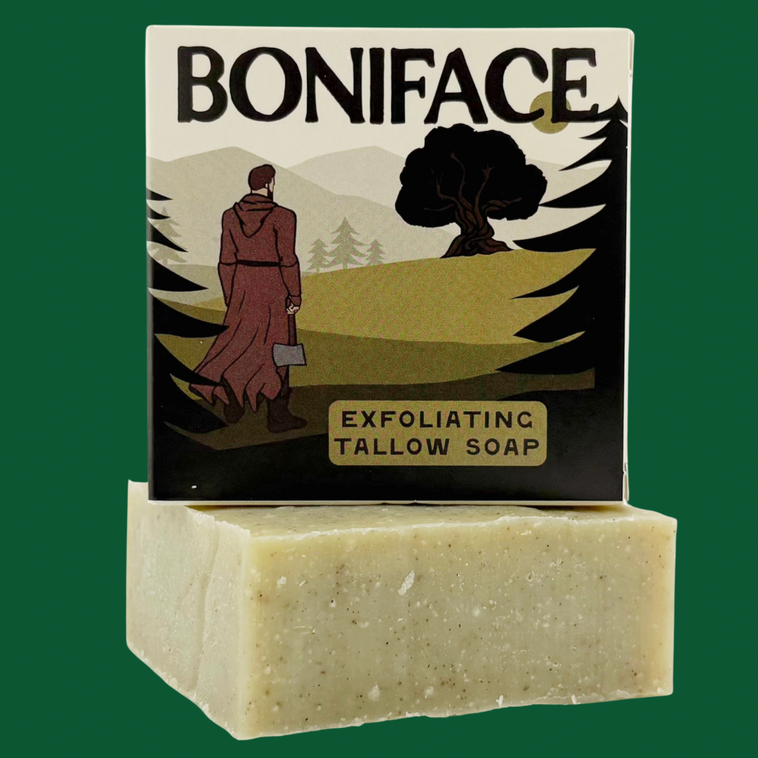 Boldness has a scent — and it smells like pine, cedarwood, and eucalyptus carried on the wind through northern timberlands. This invigorating exfoliating bar is inspired by Saint Boniface, the fearless missionary who felled the sacred “Thunder Oak” with the Cross of Christ in hand, ending pagan sacrifice and proclaiming peace in its place.