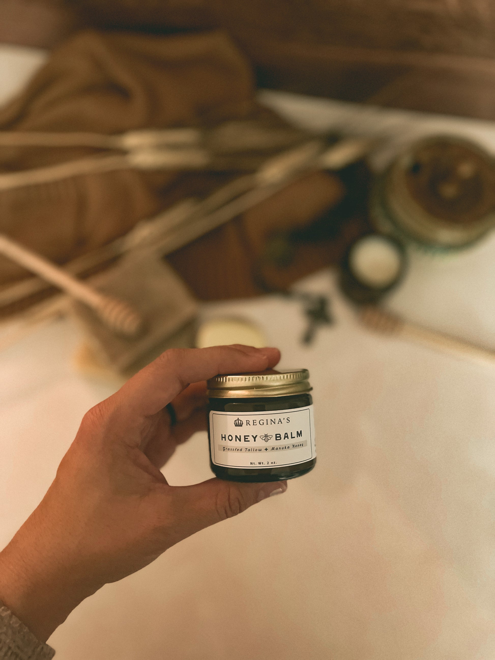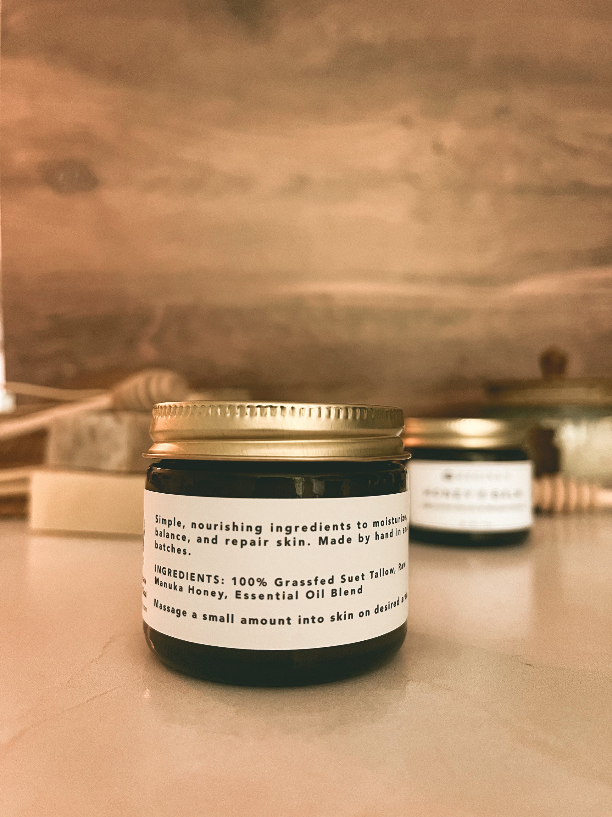 Introducing our Honey Balm, a luxurious fusion of nature’s most powerful ingredients—Grass-Fed Tallow and Raw Manuka Honey. Designed to soothe, restore, and hydrate, this balm is perfect for dry, cracked, or damaged skin. Whether you’re looking to repair rough hands, soften elbows, or pamper your skin after a hard days work, our Honey Balm delivers potent nourishment with every application. Available in two versions: Unscented and Lightly Scented.